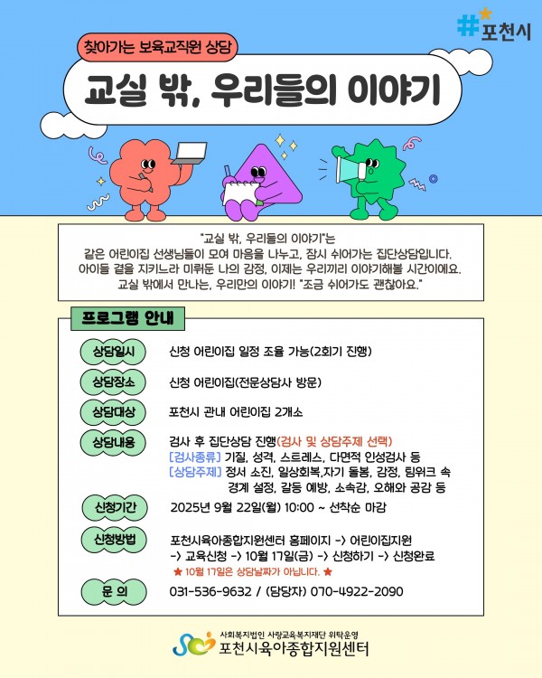▶ 신청방법: 포천시육아종합지원센터 홈페이지에서 신청가능(기관에서 대표로 1명만 신청)