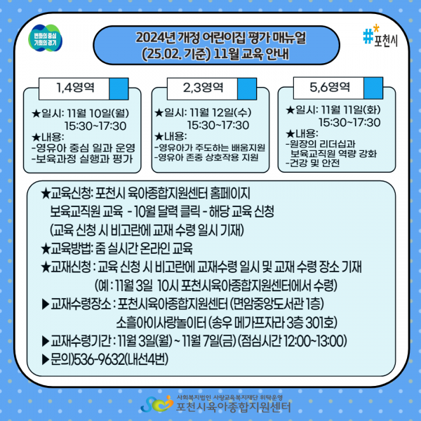 교육주제 | 2024년 개정 어린이집 평가지표 교육 1,4 영역 | ||