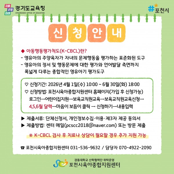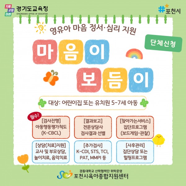 ▶ 신청방법: 포천시육아종합지원센터 홈페이지에서 신청가능(기관에서 대표로 1명만 신청)