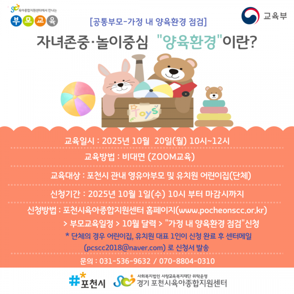 | 교육대상 | 포천시 관내 영유아가정 부모 및 어린이집, 유치원(단체) | ||