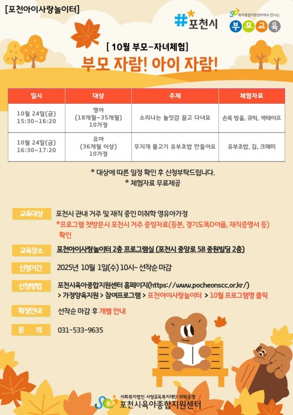 | 대상 | 포천시 관내 미취학 유아 10가정 20명(부모+자녀) | ||||