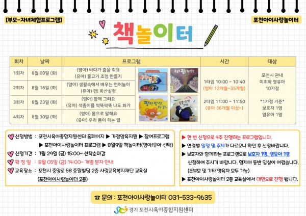 | 장소 | 포천시 중앙로 58 중원빌딩 2층 포천아이사랑놀이터(사랑교육복지재단 교육실 2층) | ||||