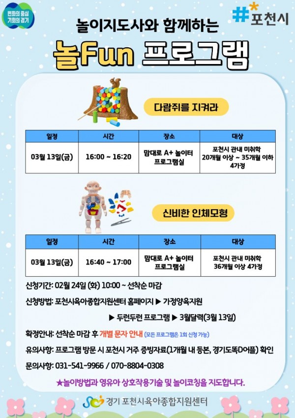 ▷모집대상 : 포천시 관내 미취학 20개월~35개월 유아 4가정