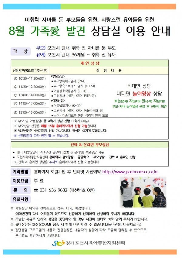 | 대상 | 포천시 미취학 자녀를 둔 부모 및 36개월 이상 유아 | ||||