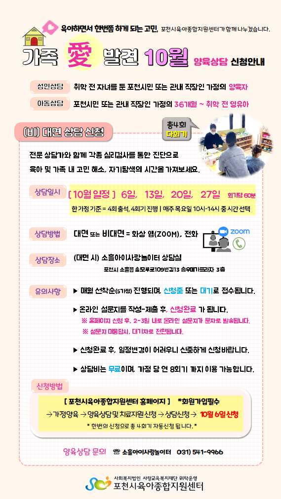 | 장소 | 소흘아이사랑놀이터 상담실, 전화, 온라인 플랫폼 | ||||