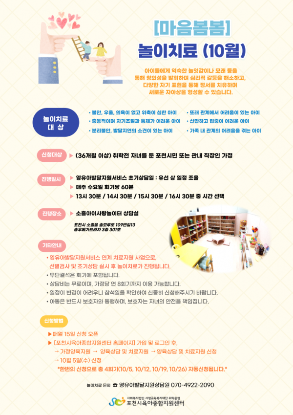 → 초기상담(9월 마지막주 예정) 실시 후 놀이치료가 진행됩니다.