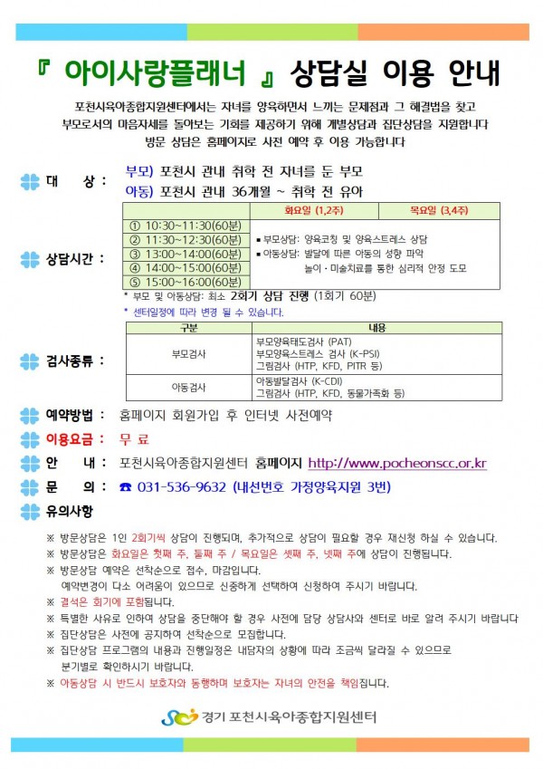 | 장소 | 포천시육아종합지원센터 아이사랑 플래너 상담실 | ||||