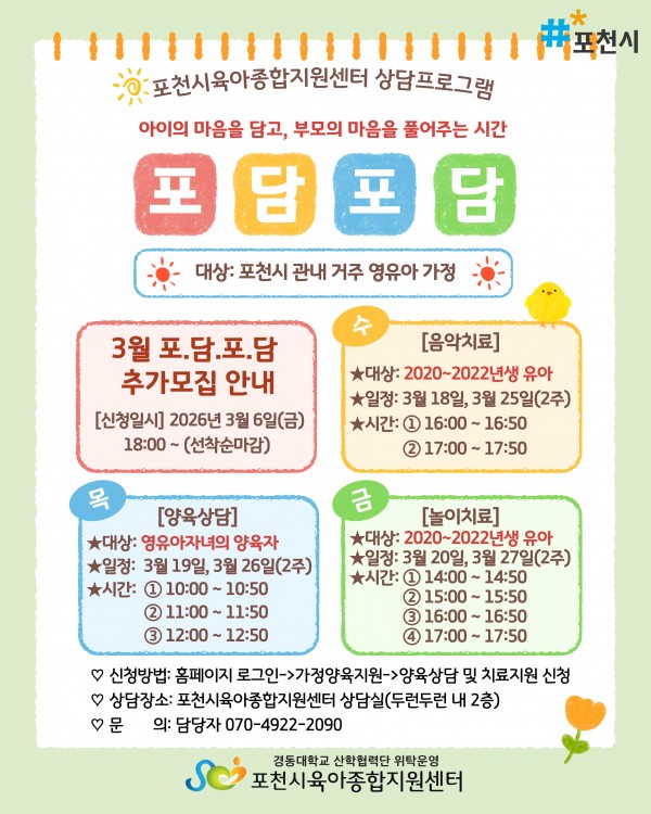 ▶ 신청방법: 포천시육아종합지원센터 홈페이지에서 신청가능