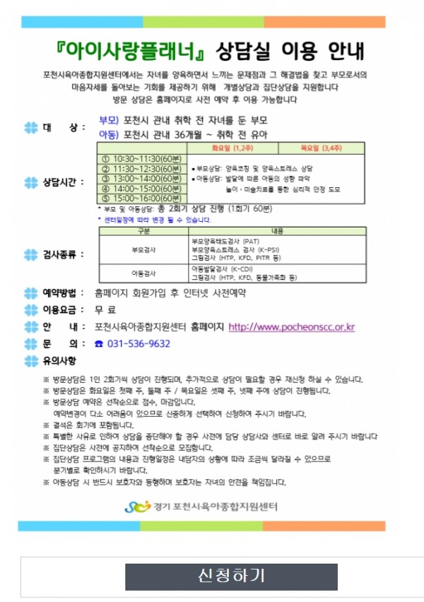 | 장소 | 포천시육아종합지원센터 아이사랑 플래너 상담실 | ||||