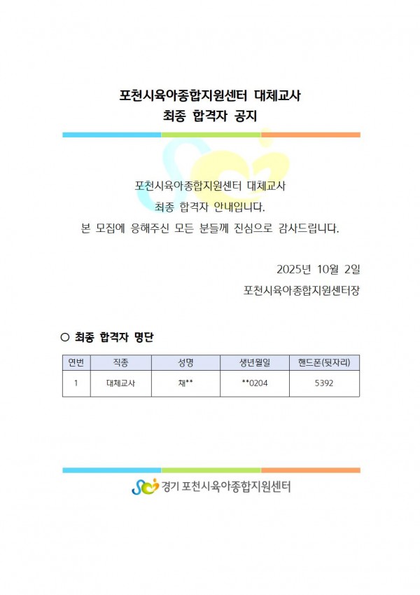 [공지] 포천시육아종합지원센터 대체교사 최종 합격자 공지 페이지 정보 작성자 포천센터 작성일25-10-02 11:54 조회131회 댓글0건 첨부파일 3. 최종 합격자 공지-대체교사001.jpg (75.2K) 0회 다운로드 DATE : 2025-10-02 11:54:59 관련링크 이전글 다음글 목록 본문 포천시육아종합지원센터 대체교사 최종 합격자 공지 이전글 다음글 목록