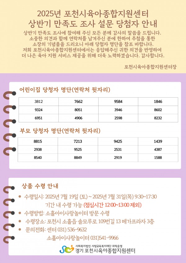 [안내] 2025 포천시육아종합지원센터 반기 만족도 조사 참여 당첨자 및 결과 안내