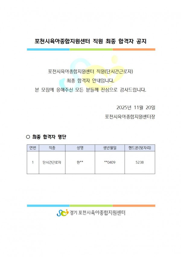 [공지]포천시육아종합지원센터 단시간근로자 최종 합격자 공지