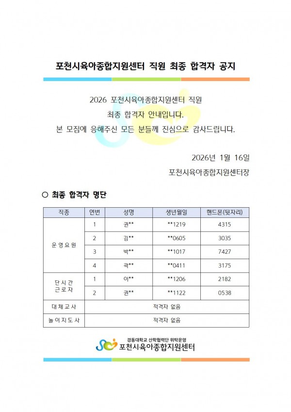 [공지] 2026 포천시육아종합지원센터 최종합격자 공지