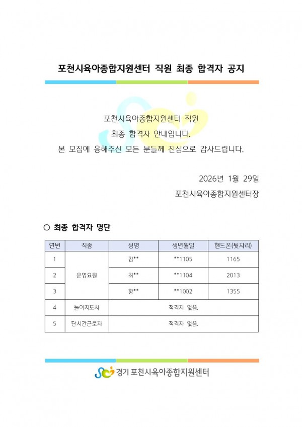 [공지] 포천시육아종합지원센터 직원 최종 합격자 안내입니다.
