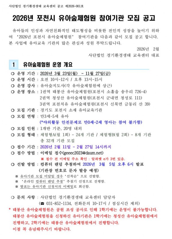 [공지] 2026년 포천시 유아숲체험원 참여기관 모집 공고 안내