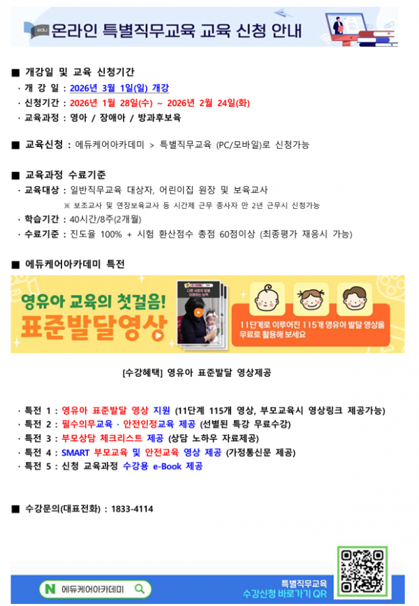 [에듀케어아카데미] 보육교직원 온라인 특별직무교육 2026년 3월 개강반 교육신청 안내