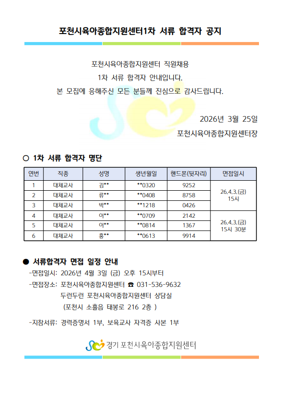 [공지] 포천시육아종합지원센터 직원채용 1차 서류합격 안내