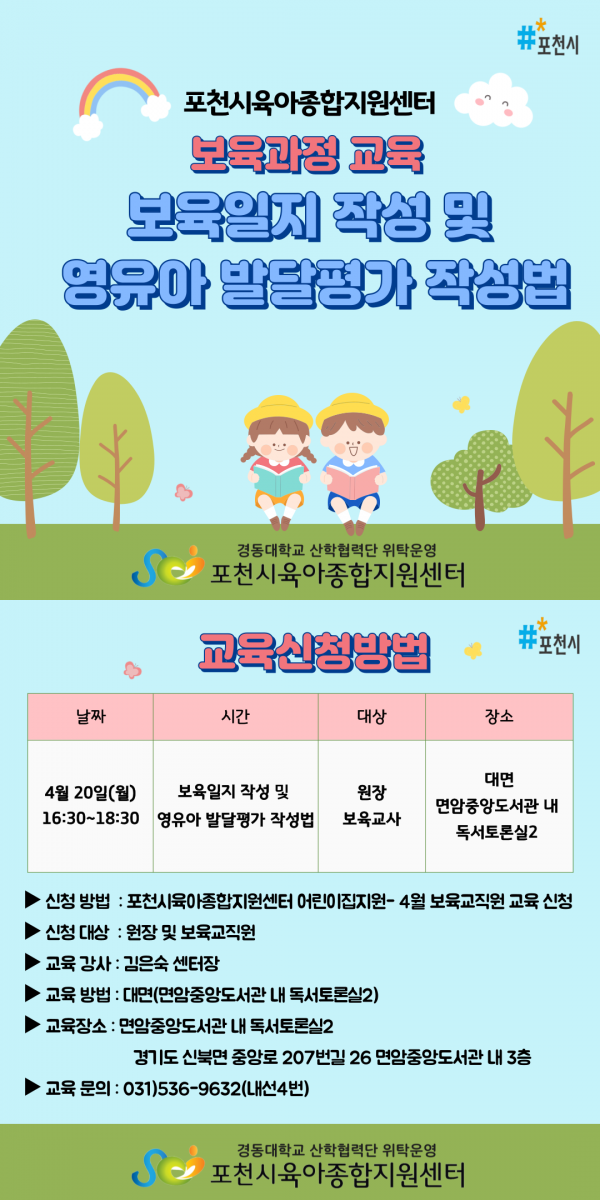 [보수교육연계] 보육일지 작성 및 영유아 발달평가 작성법 > 보육교직원 교육신청 | 포천시육아종합지원센터